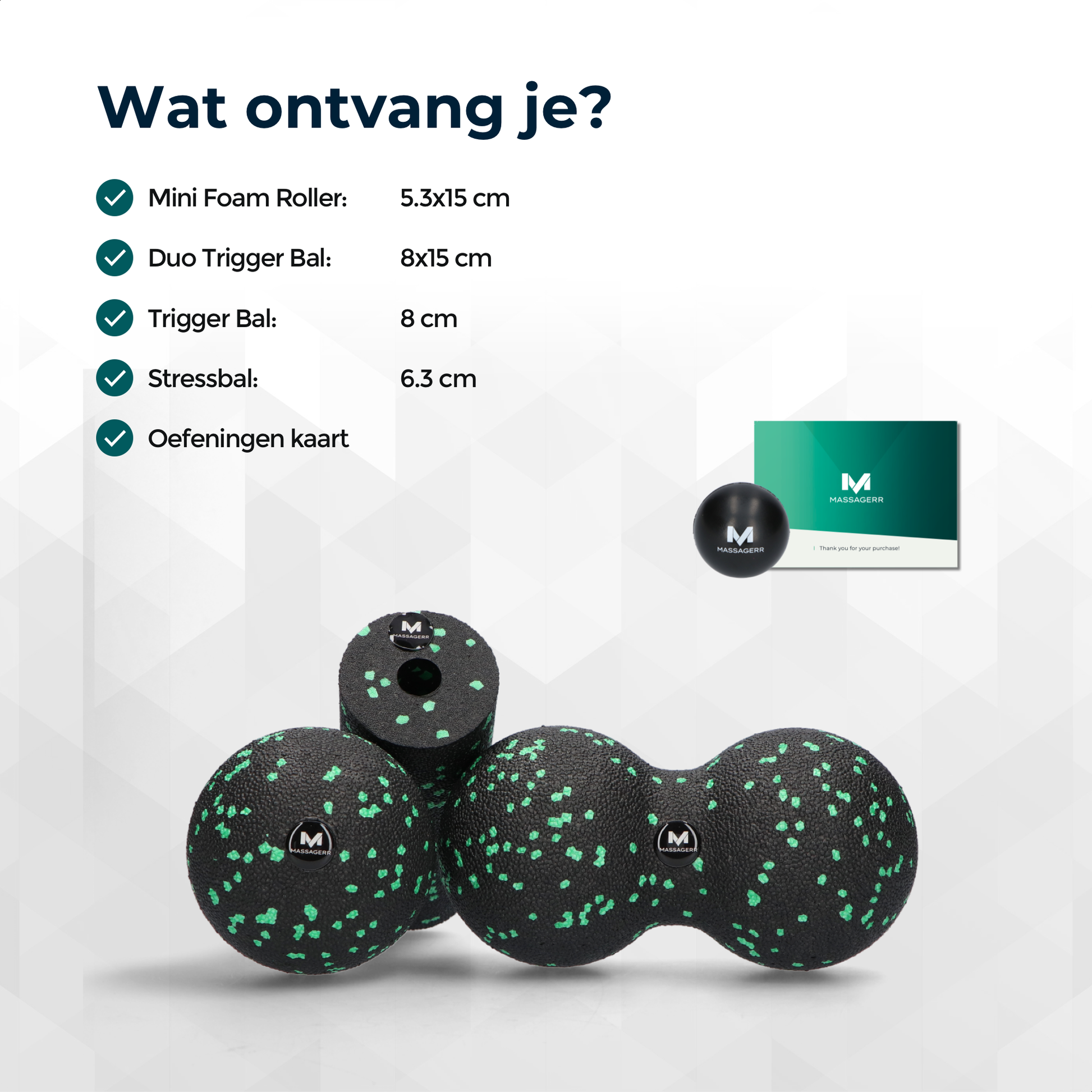 Zoek je naar diepe ontspanning en verlichting van hardnekkige triggerpoints? De Massagerr Mini Box is speciaal ontworpen voor jou. Deze set biedt een combinatie van tools die gericht zijn op het losmaken van specifieke drukpunten en het verminderen van spierspanning. De triggerpoint massagebal en duo triggerpoint massagebal richten zich specifiek op diepe spanningen, terwijl de mini foamroller zorgt voor een algehele spierontspanning. En voor momenten van mentale stress is er de stressbal. Geef jezelf de gift van ontspanning en welzijn met de Massagerr Mini Box.